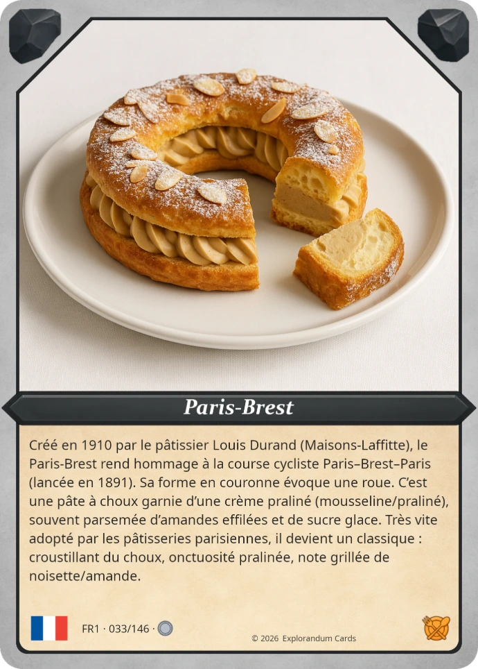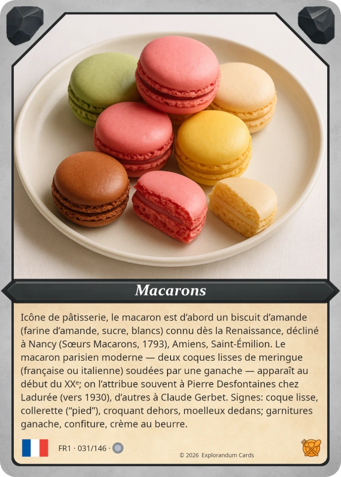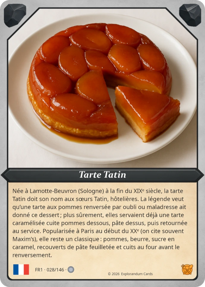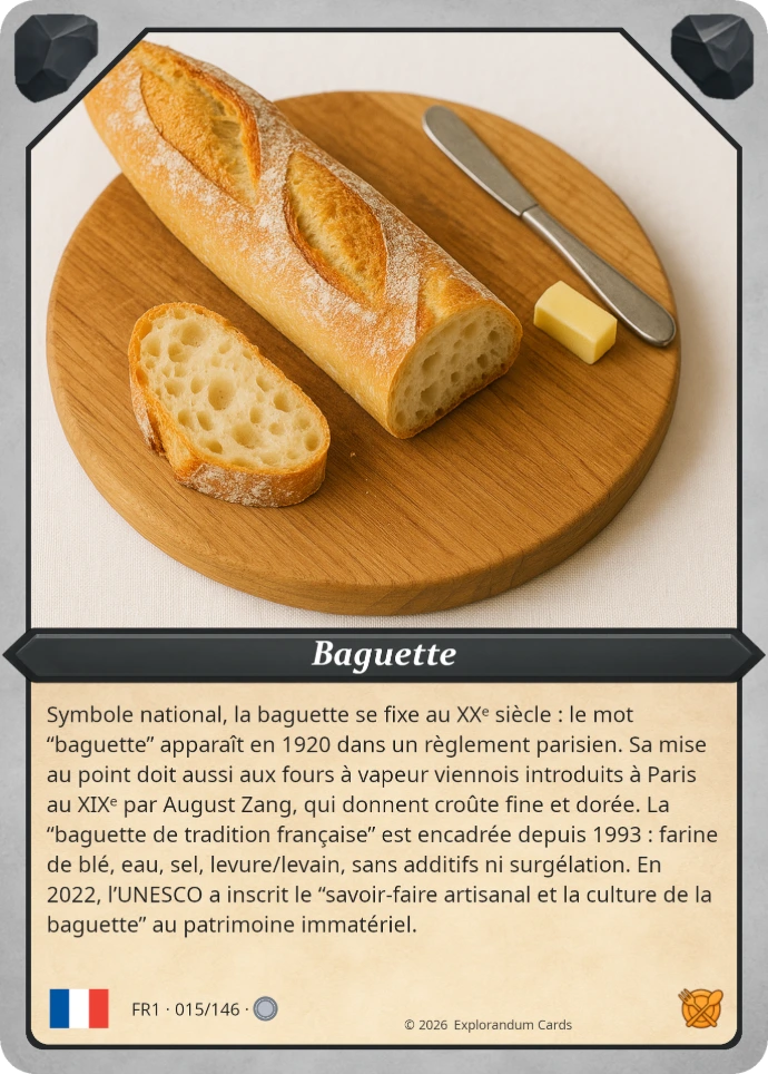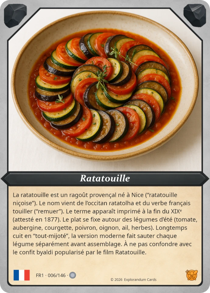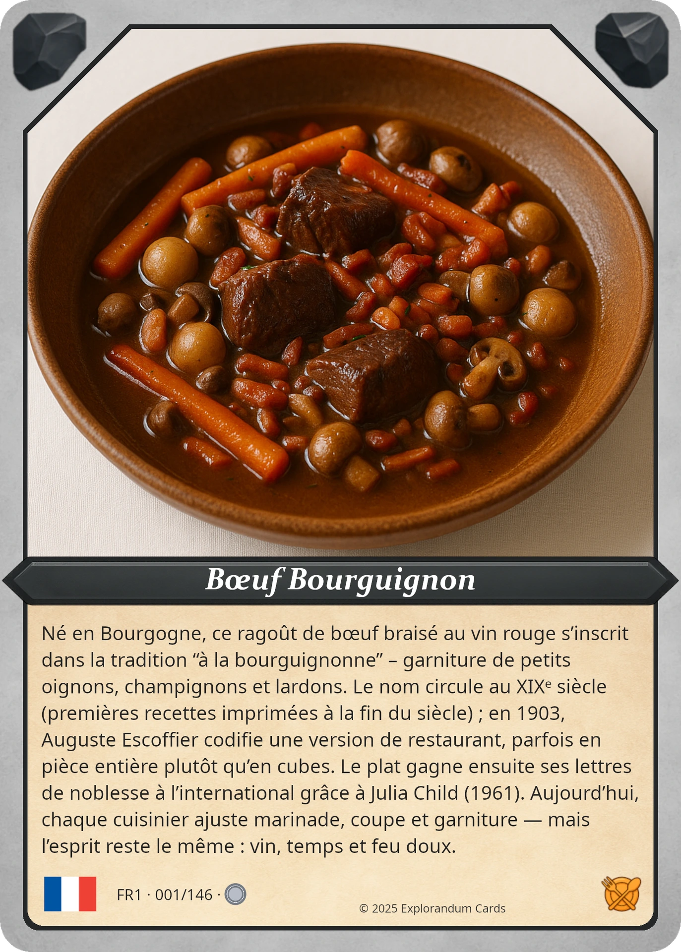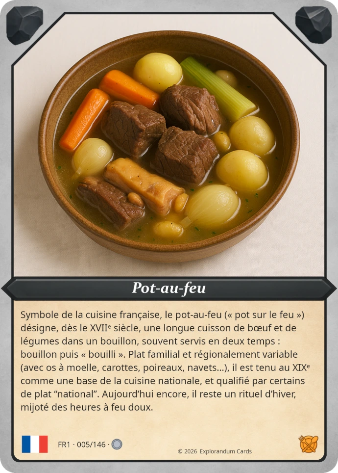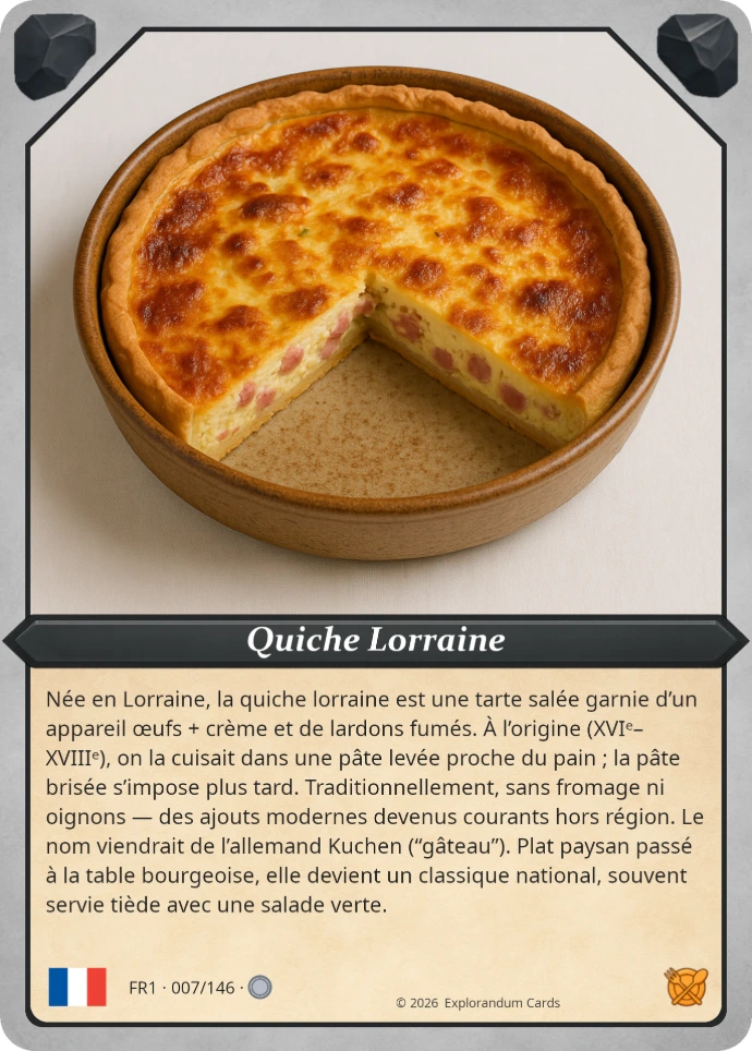 Bienvenue dans la première série de cartes à collectionner Explorandum, dédiée aux richesses culturelles de la France. Ce set inaugural célèbre la diversité du patrimoine français, des montagnes alpines aux côtes méditerranéennes. Collectionnez les saveurs emblématiques, explorez les régions et plongez dans l'histoire de plats qui ont façonné l'identité nationale. Que votre voyage de collection commence ici !