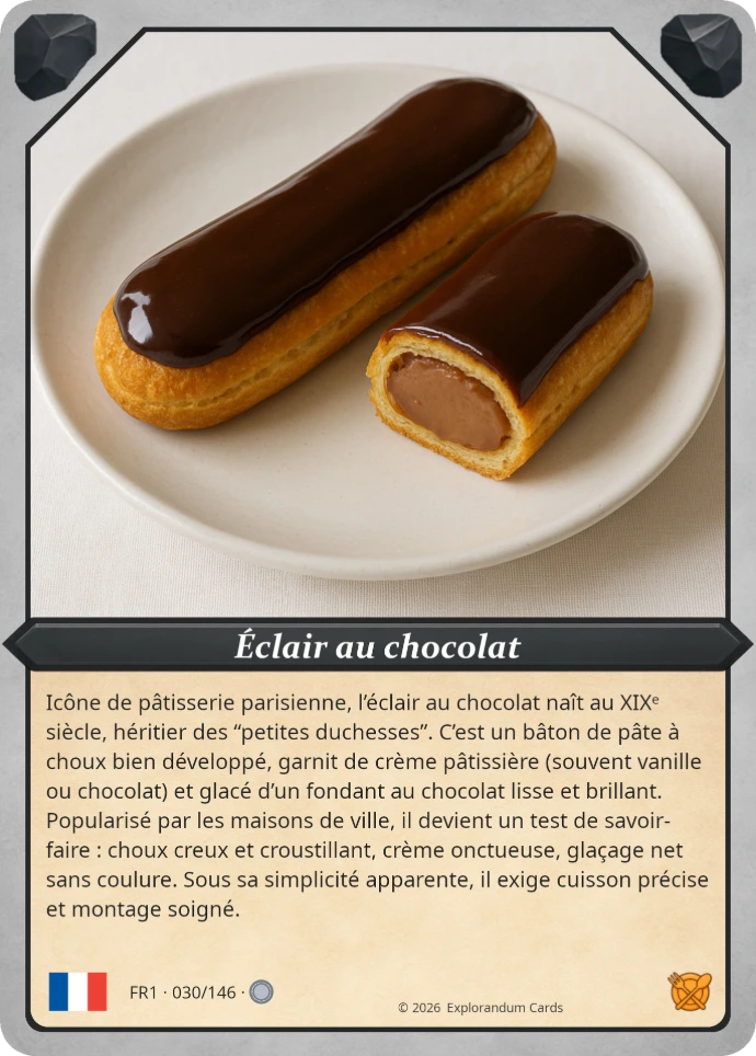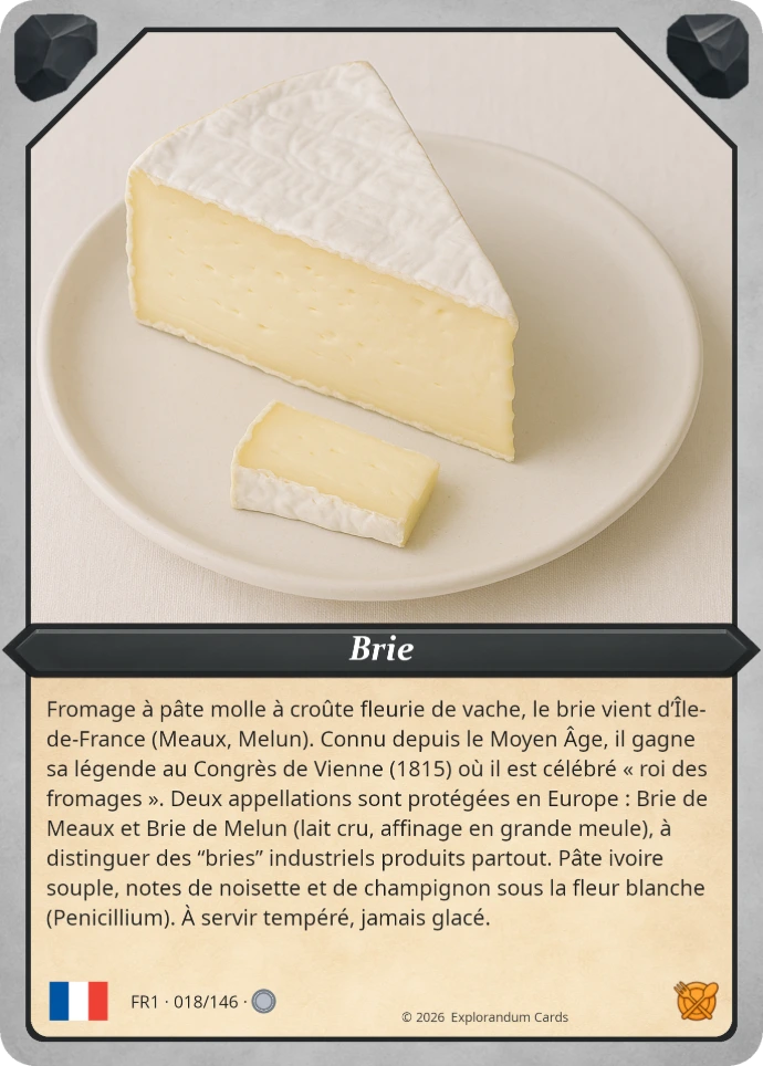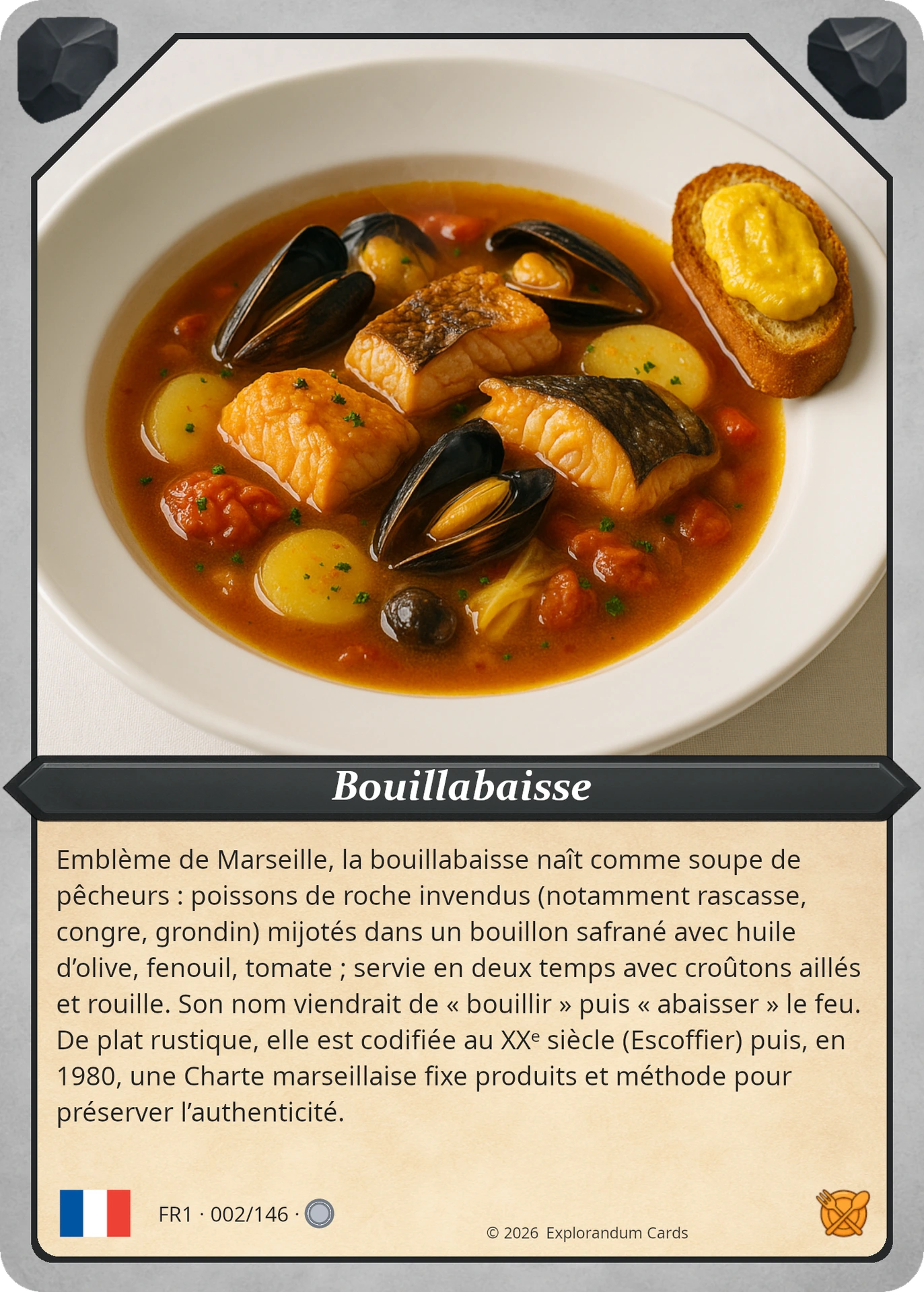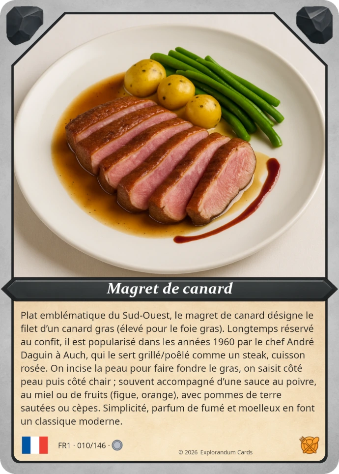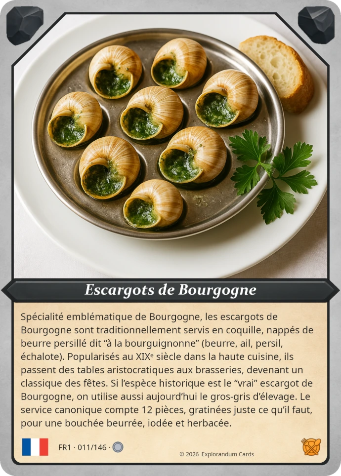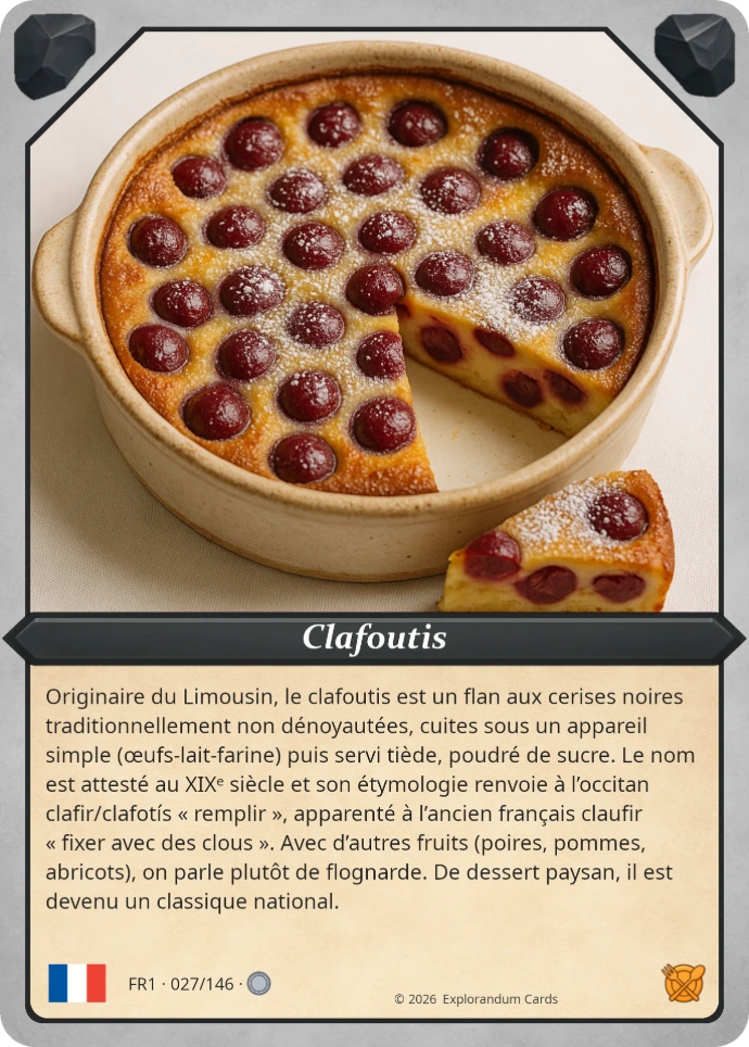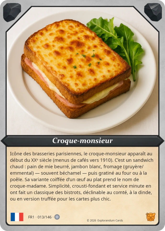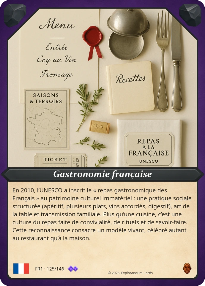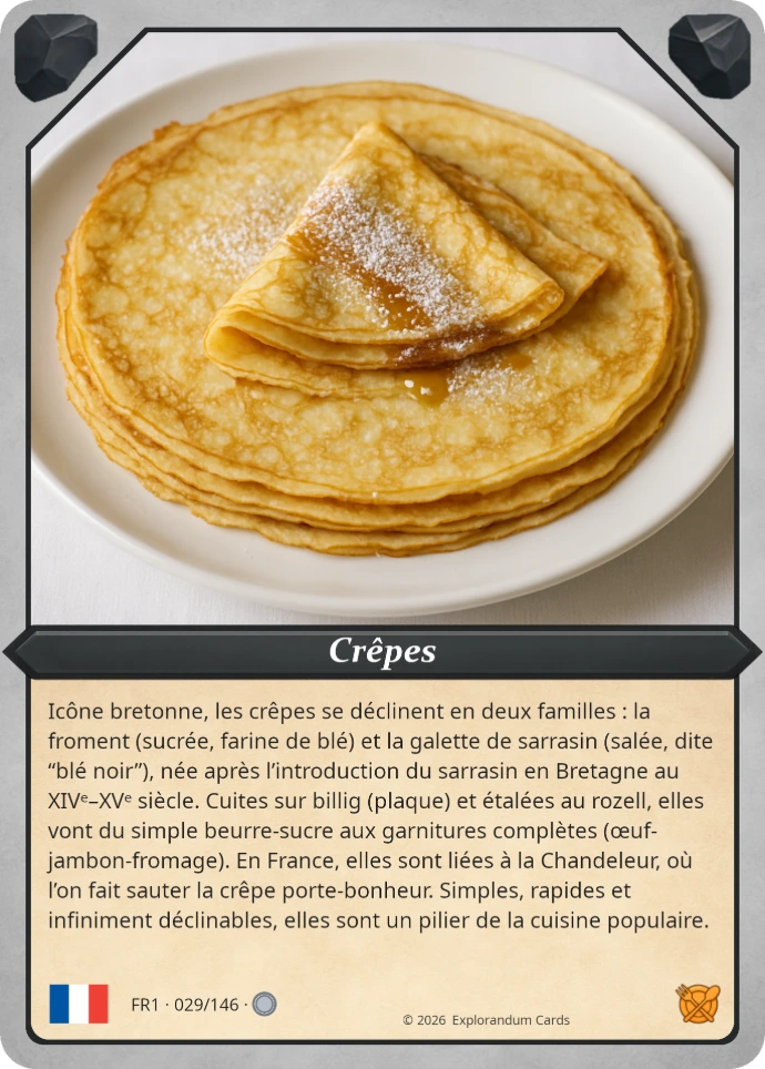 Bienvenue dans la première série de cartes à collectionner Explorandum, dédiée aux richesses culturelles de la France. Ce set inaugural célèbre la diversité du patrimoine français, des montagnes alpines aux côtes méditerranéennes. Collectionnez les saveurs emblématiques, explorez les régions et plongez dans l'histoire de plats qui ont façonné l'identité nationale. Que votre voyage de collection commence ici !