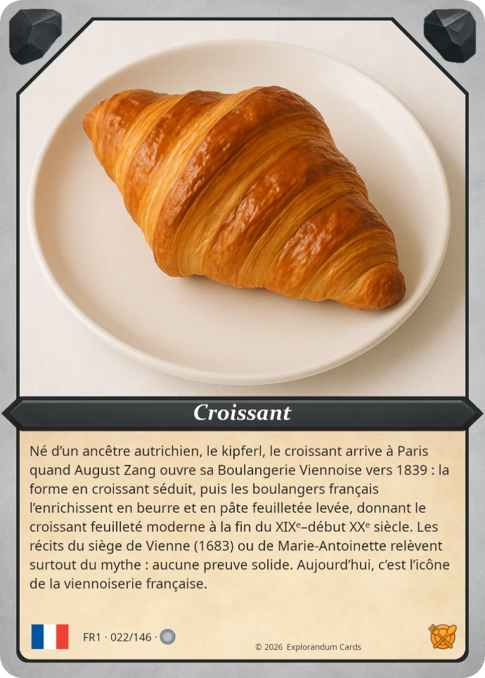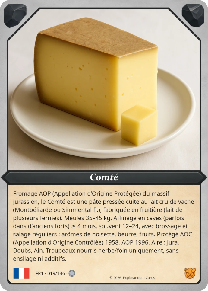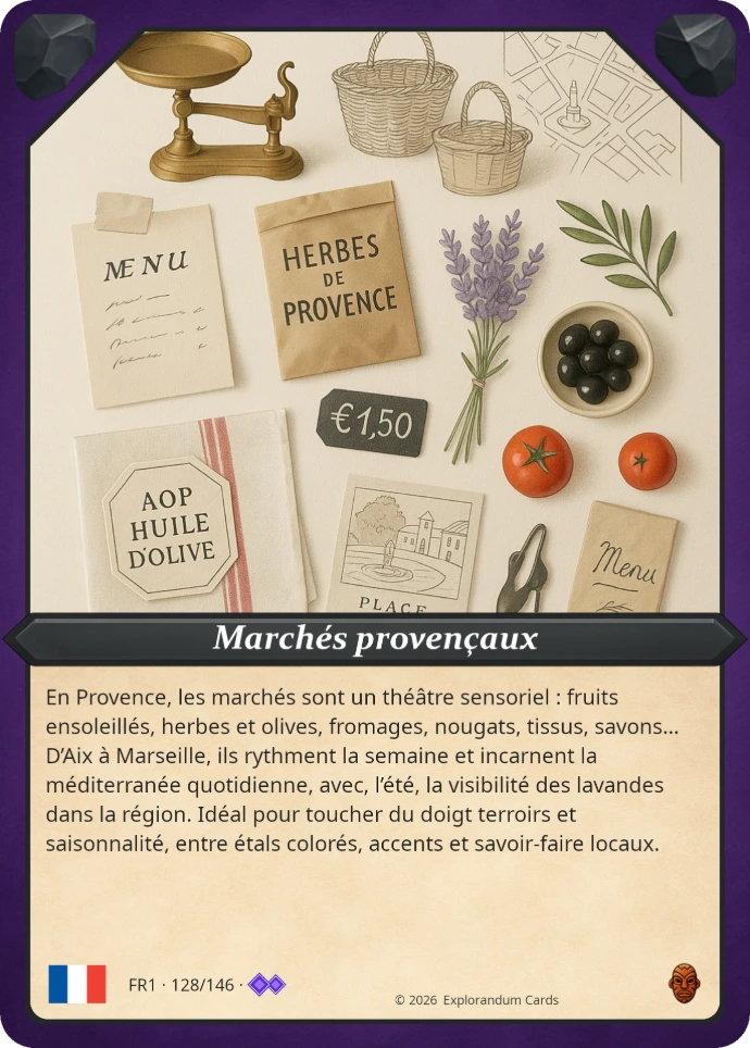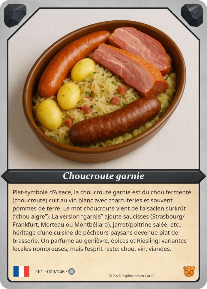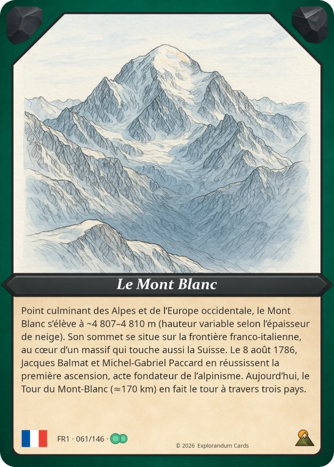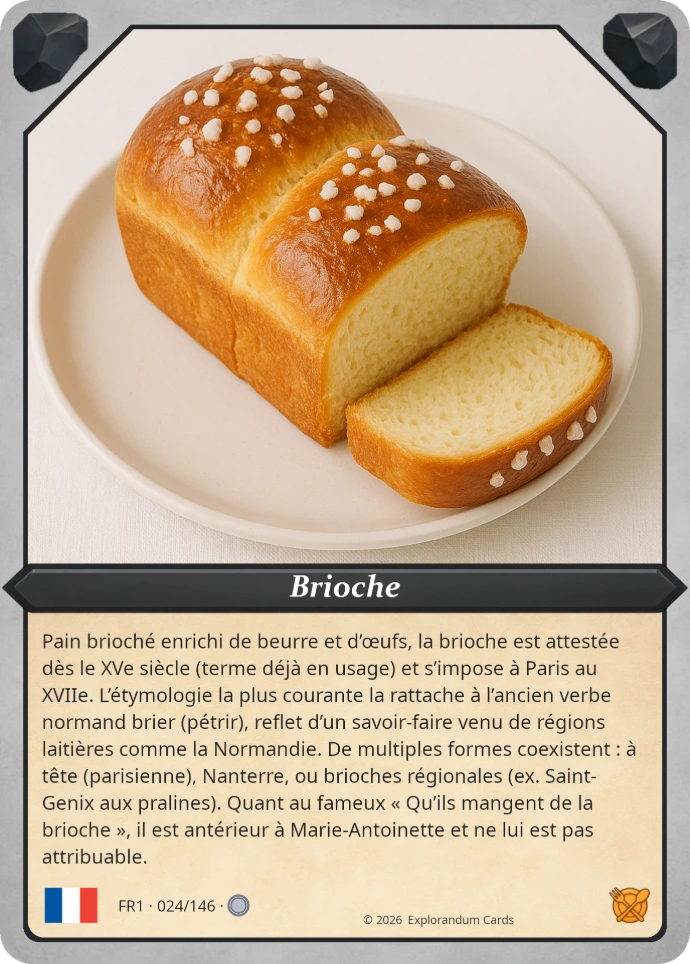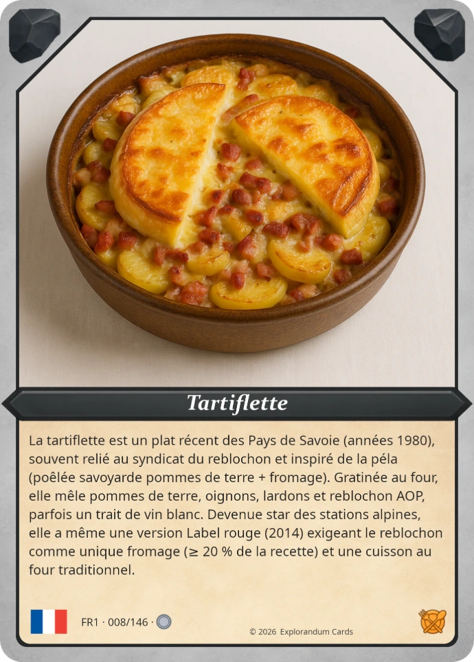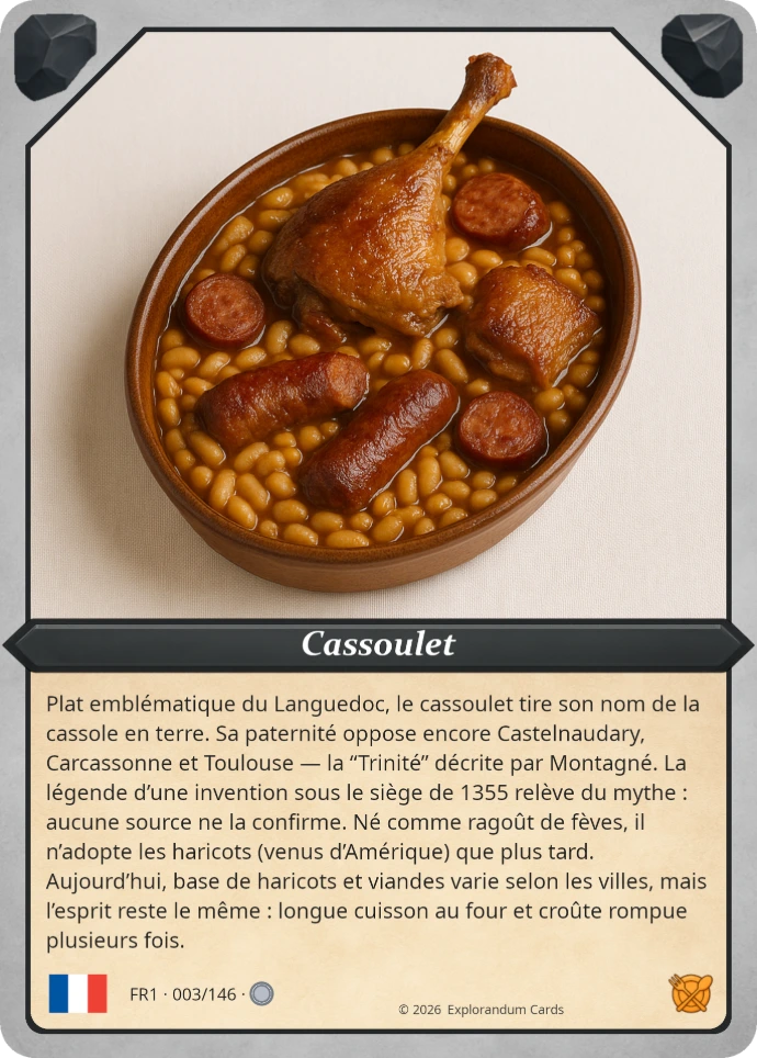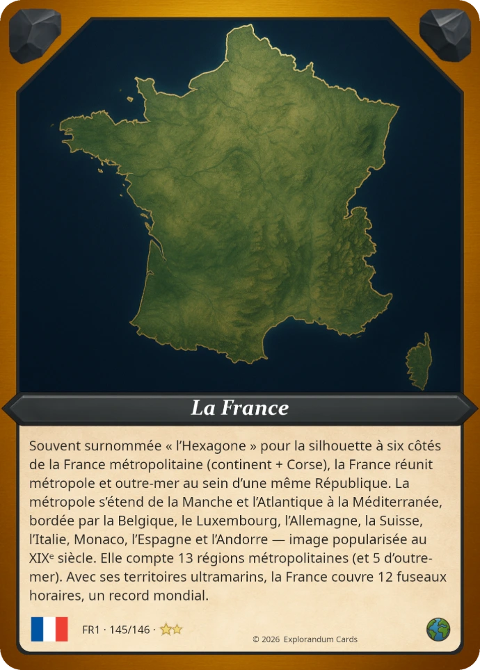 Bienvenue dans la première série de cartes à collectionner Explorandum, dédiée aux richesses culturelles de la France. Ce set inaugural célèbre la diversité du patrimoine français, des montagnes alpines aux côtes méditerranéennes. Collectionnez les saveurs emblématiques, explorez les régions et plongez dans l'histoire de plats qui ont façonné l'identité nationale. Que votre voyage de collection commence ici !