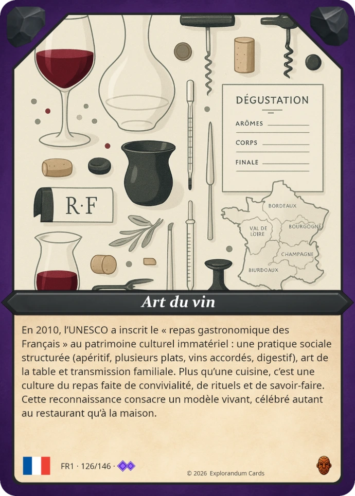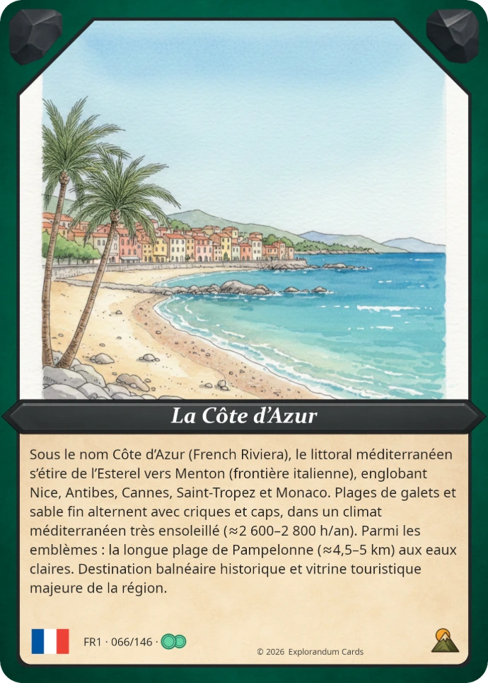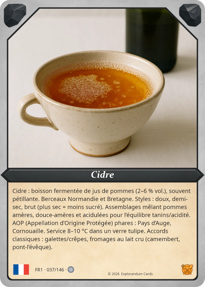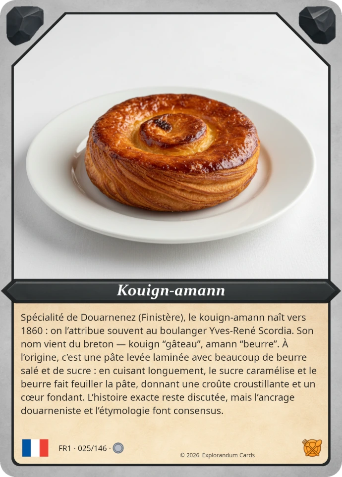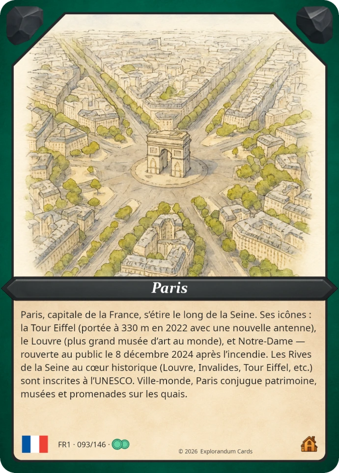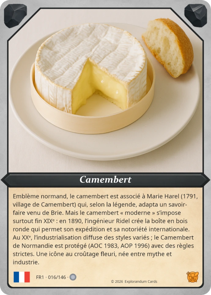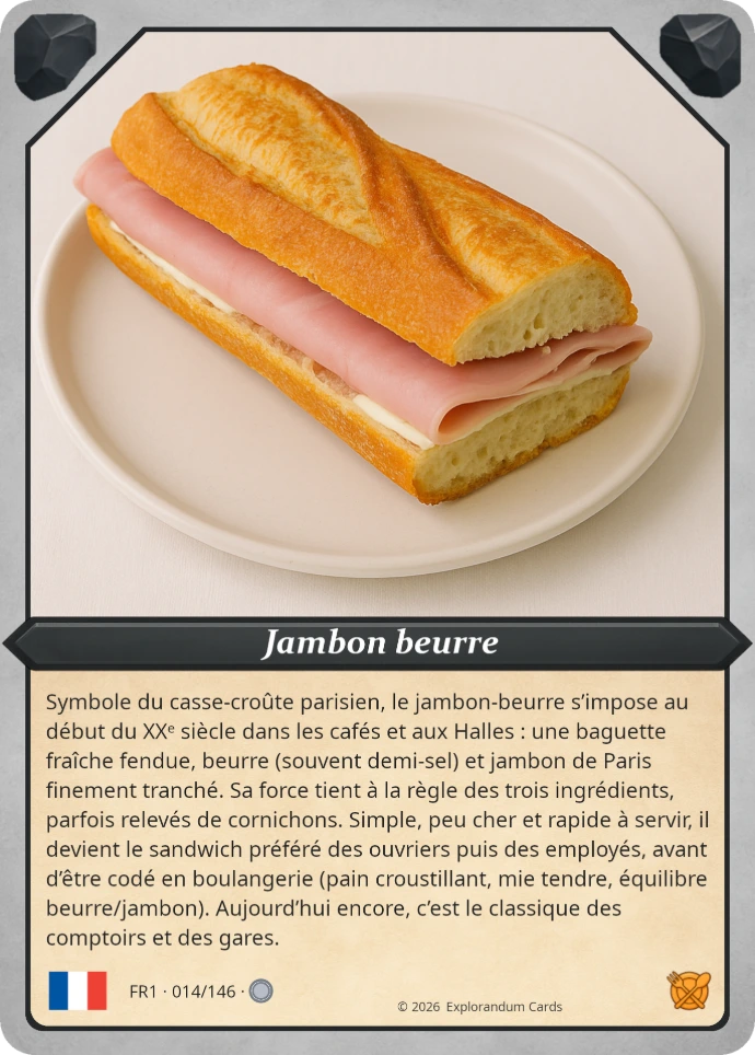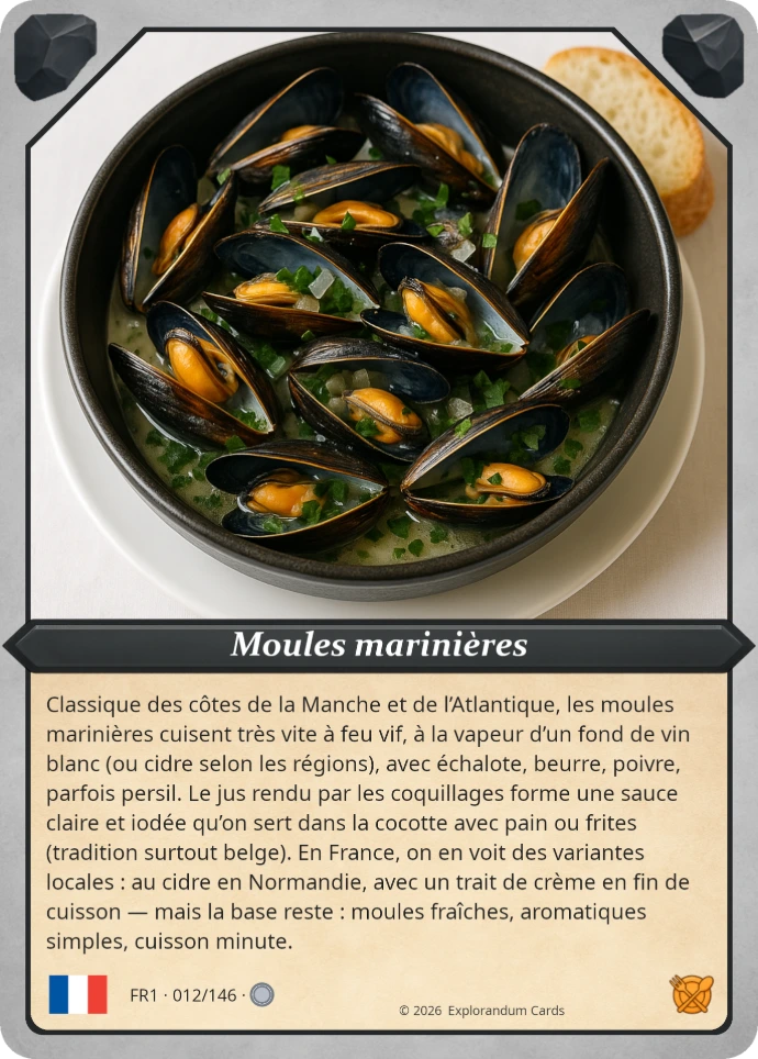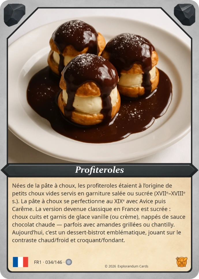 Bienvenue dans la première série de cartes à collectionner Explorandum, dédiée aux richesses culturelles de la France. Ce set inaugural célèbre la diversité du patrimoine français, des montagnes alpines aux côtes méditerranéennes. Collectionnez les saveurs emblématiques, explorez les régions et plongez dans l'histoire de plats qui ont façonné l'identité nationale. Que votre voyage de collection commence ici !