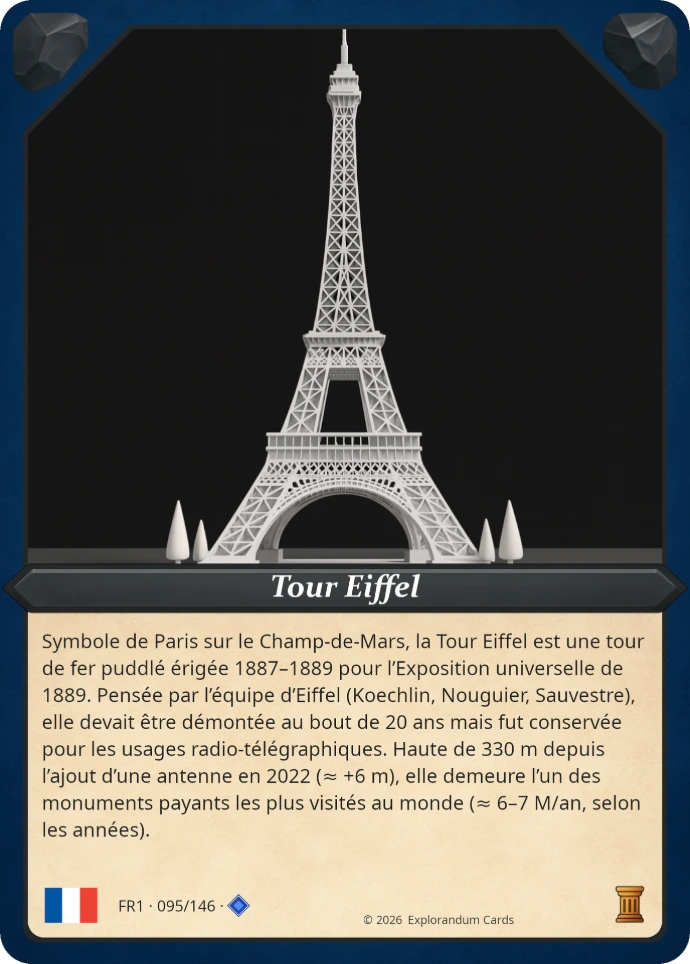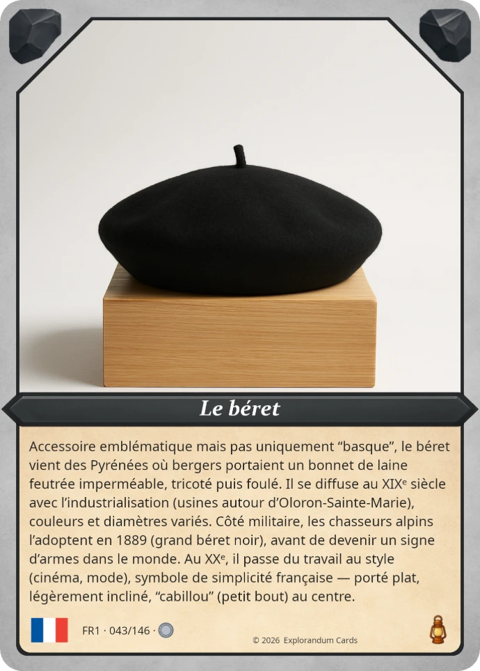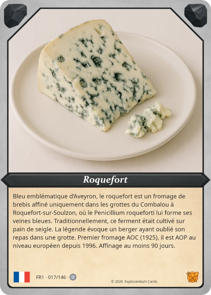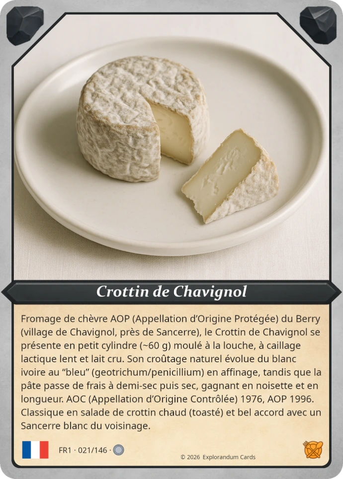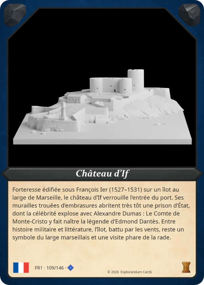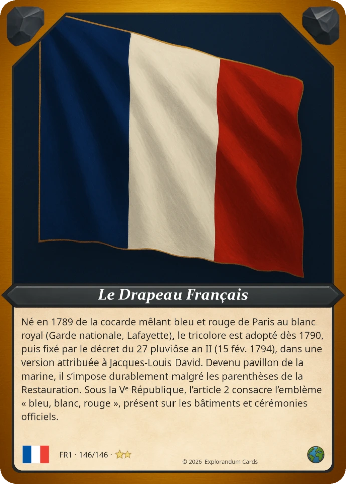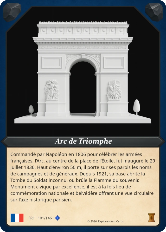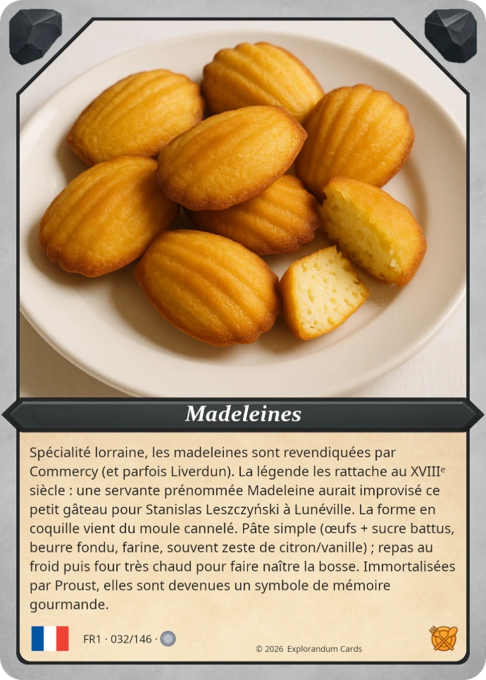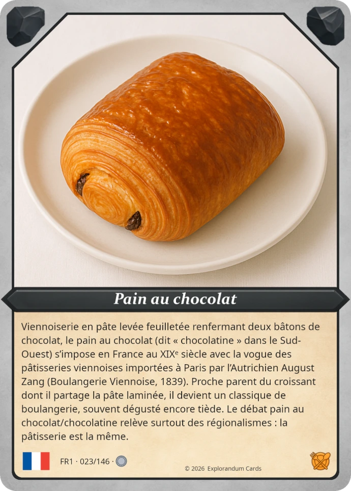 Bienvenue dans la première série de cartes à collectionner Explorandum, dédiée aux richesses culturelles de la France. Ce set inaugural célèbre la diversité du patrimoine français, des montagnes alpines aux côtes méditerranéennes. Collectionnez les saveurs emblématiques, explorez les régions et plongez dans l'histoire de plats qui ont façonné l'identité nationale. Que votre voyage de collection commence ici !