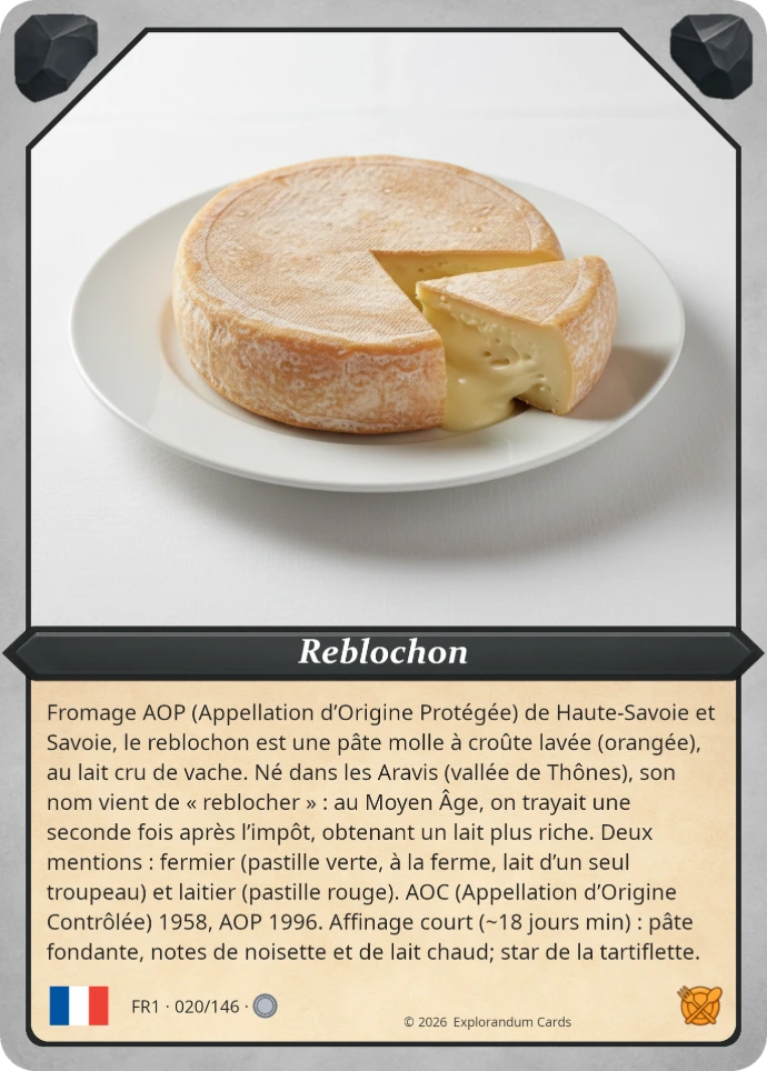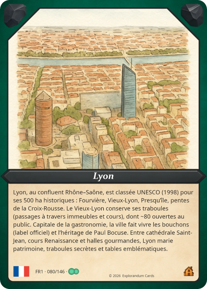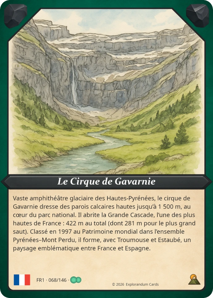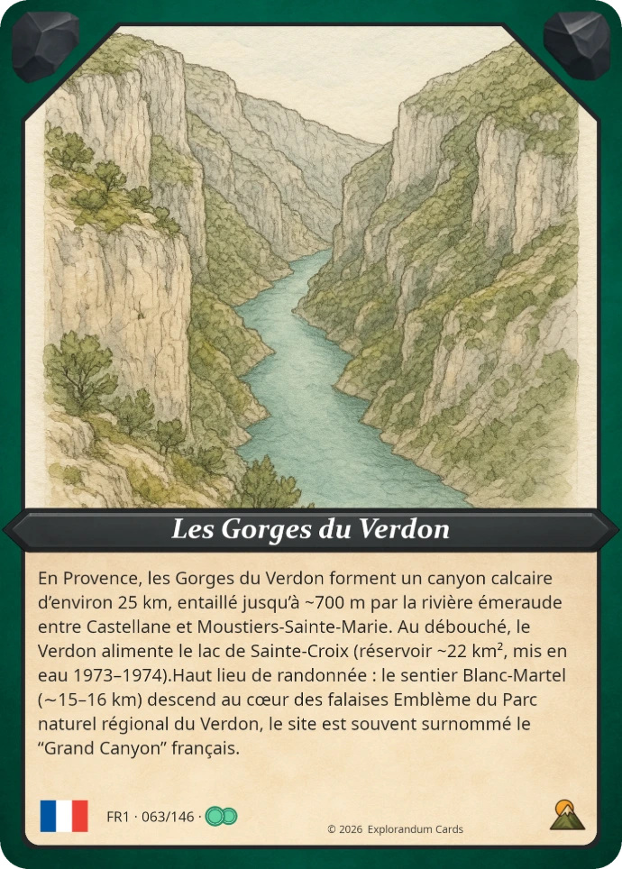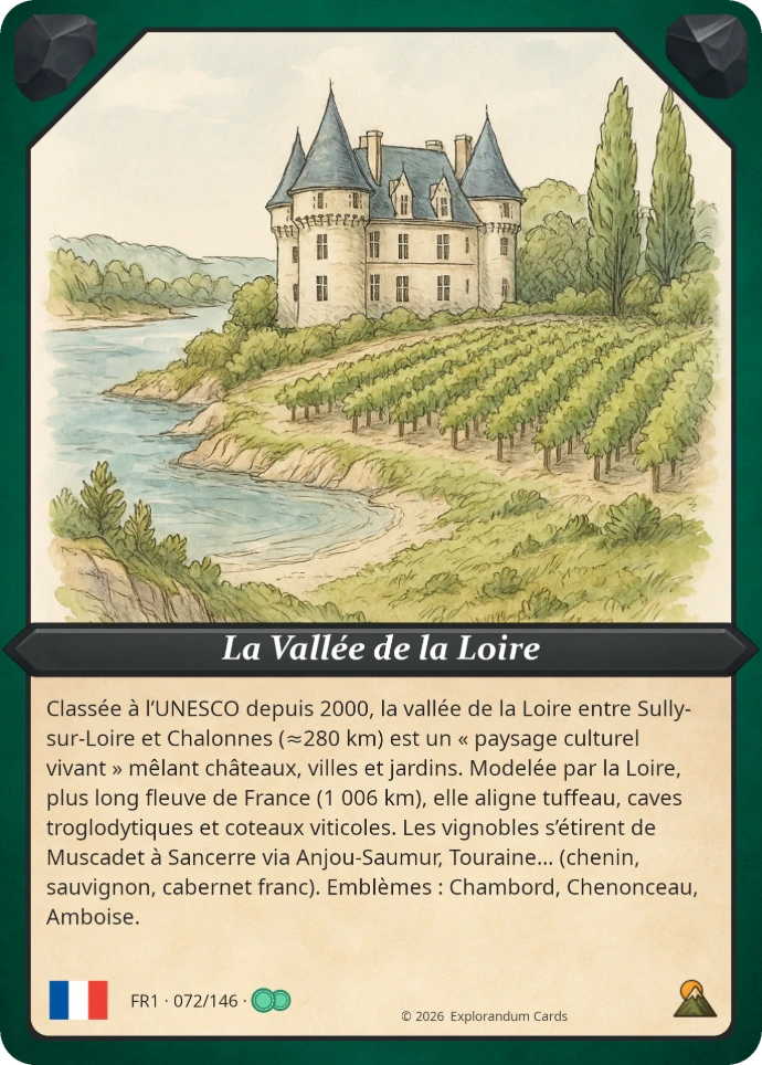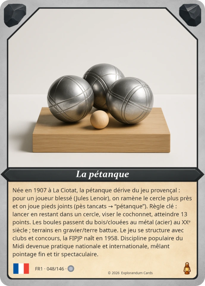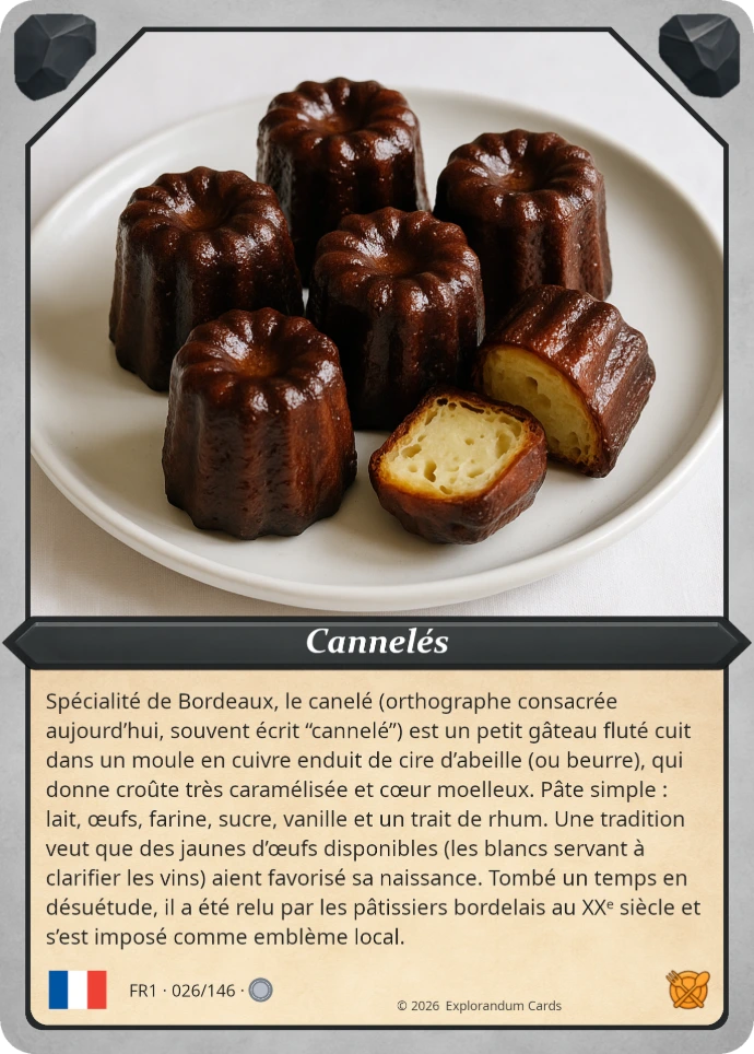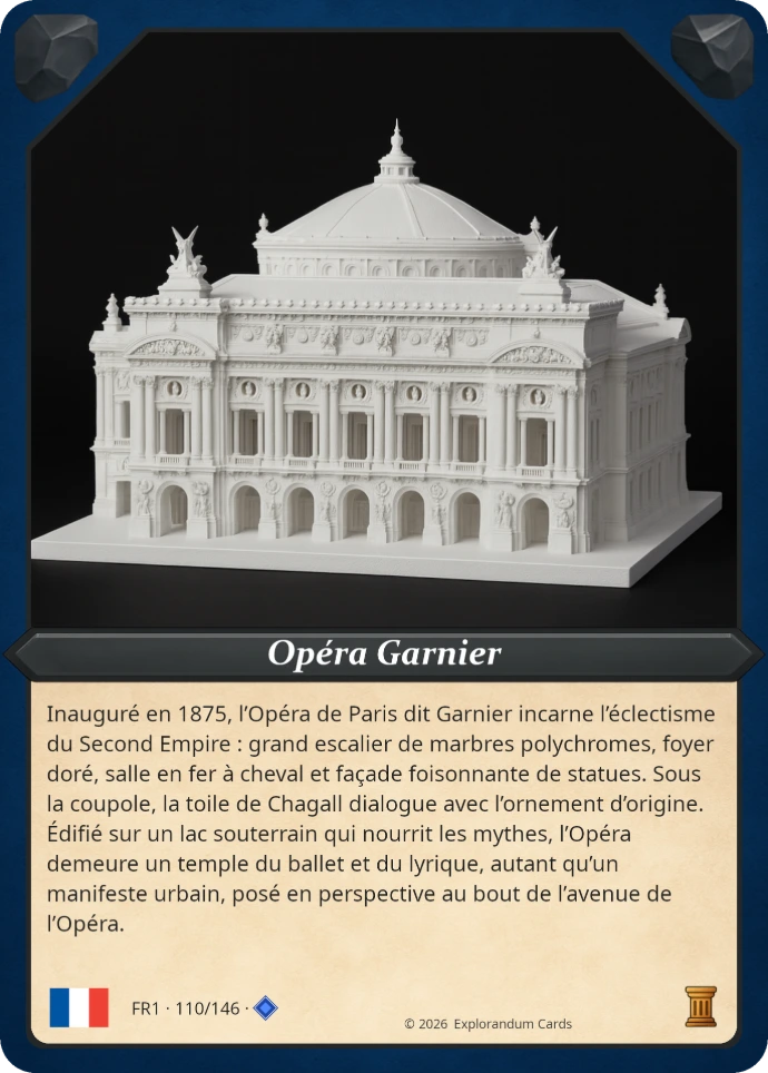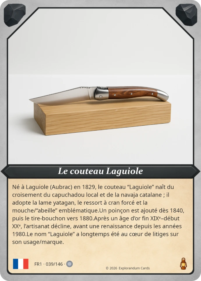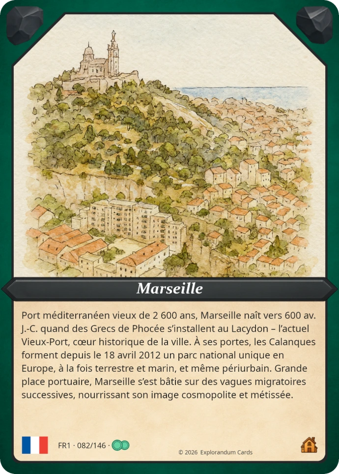 Bienvenue dans la première série de cartes à collectionner Explorandum, dédiée aux richesses culturelles de la France. Ce set inaugural célèbre la diversité du patrimoine français, des montagnes alpines aux côtes méditerranéennes. Collectionnez les saveurs emblématiques, explorez les régions et plongez dans l'histoire de plats qui ont façonné l'identité nationale. Que votre voyage de collection commence ici !