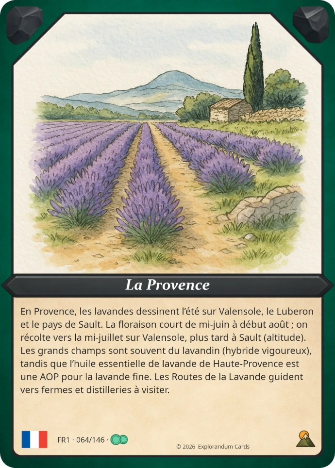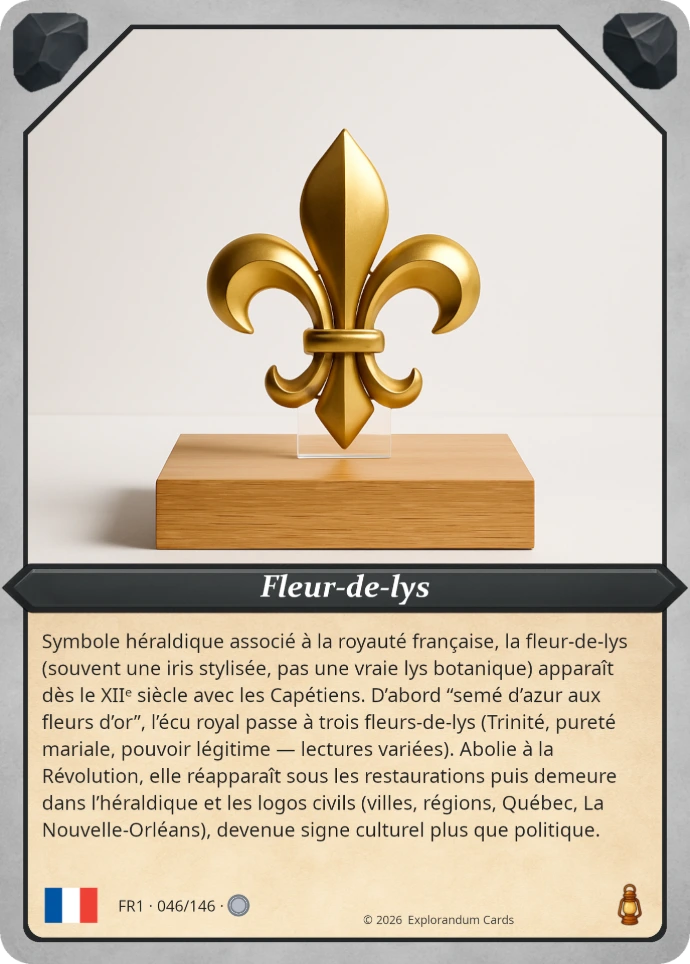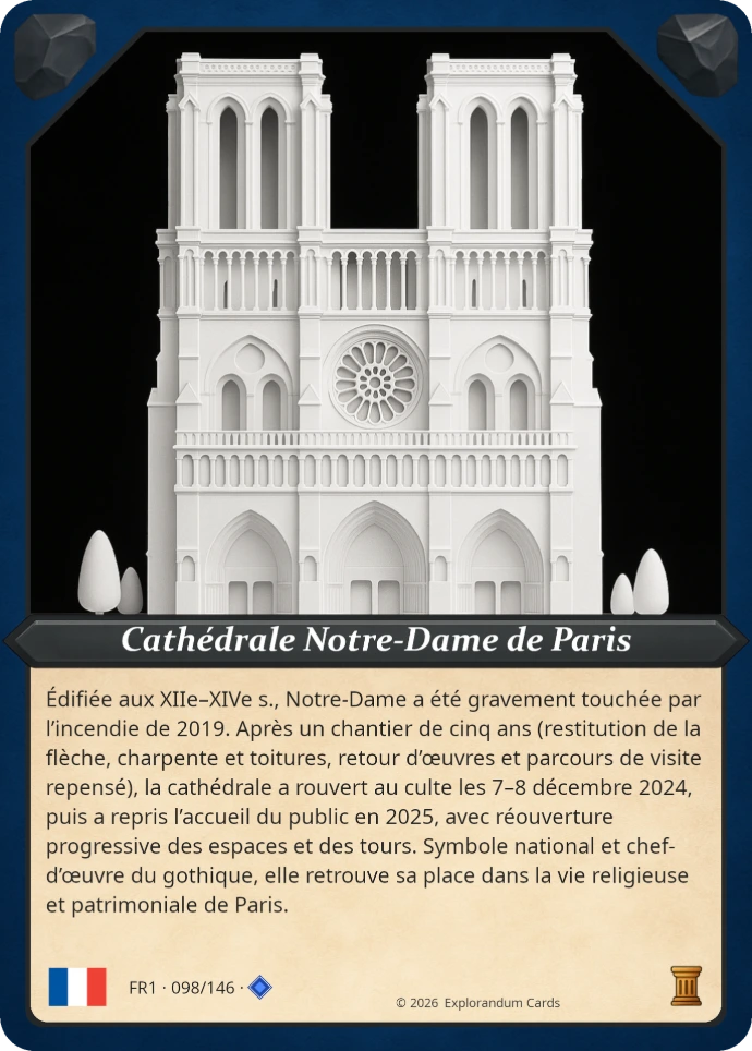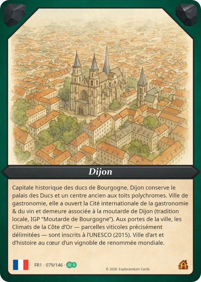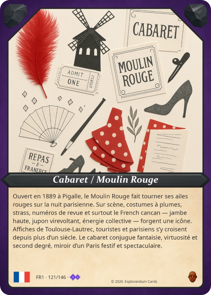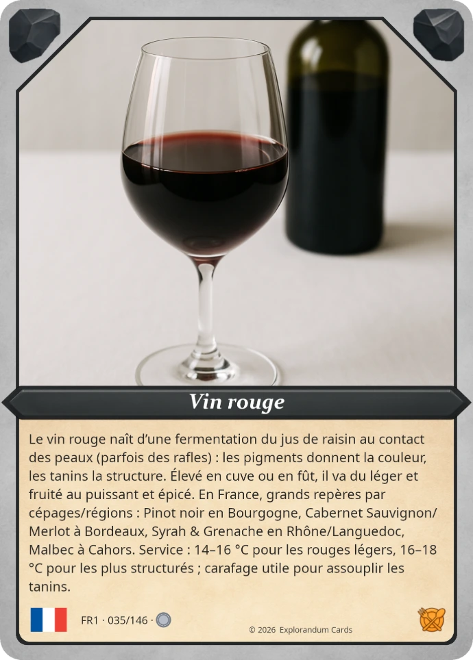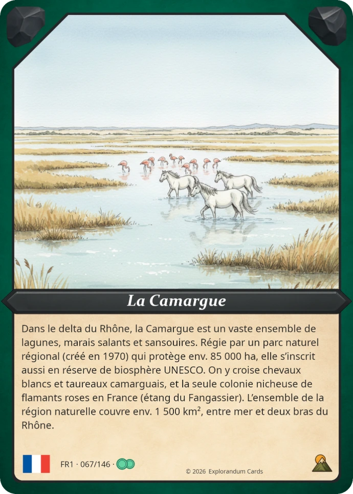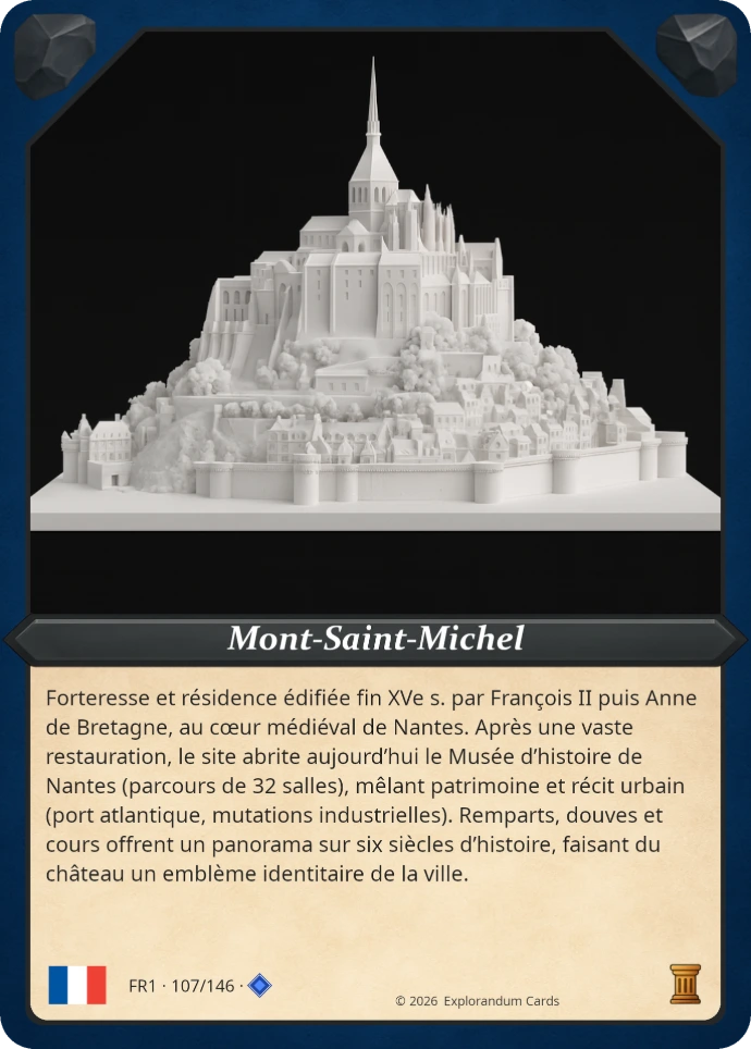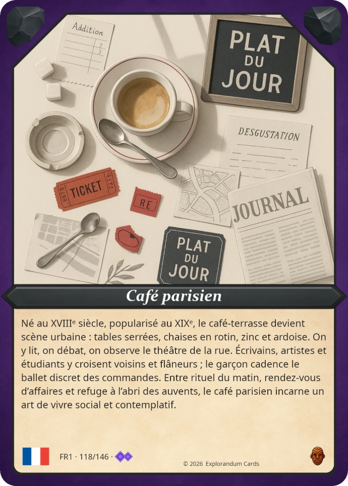 Bienvenue dans la première série de cartes à collectionner Explorandum, dédiée aux richesses culturelles de la France. Ce set inaugural célèbre la diversité du patrimoine français, des montagnes alpines aux côtes méditerranéennes. Collectionnez les saveurs emblématiques, explorez les régions et plongez dans l'histoire de plats qui ont façonné l'identité nationale. Que votre voyage de collection commence ici !