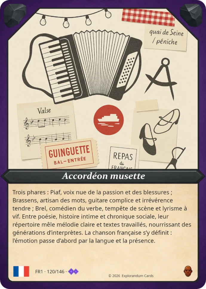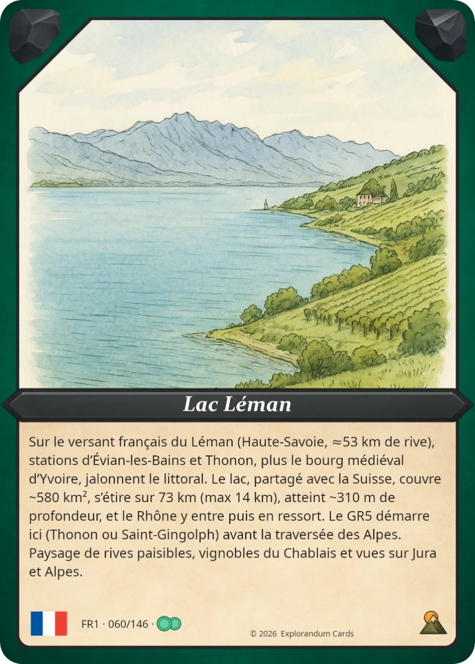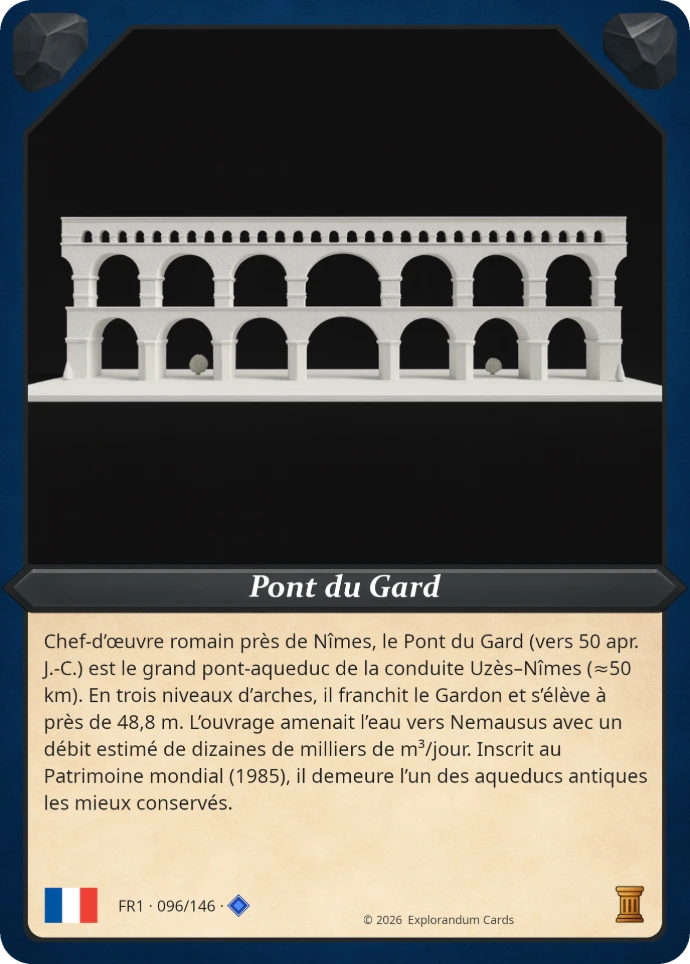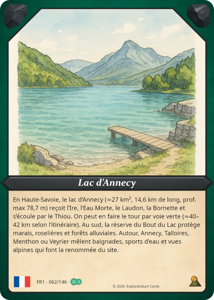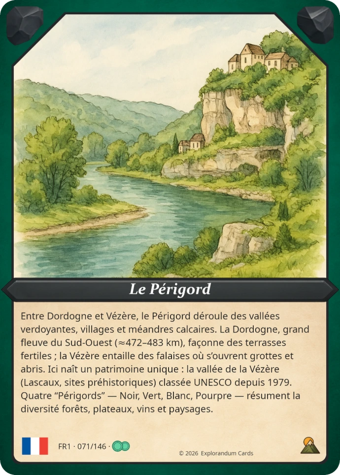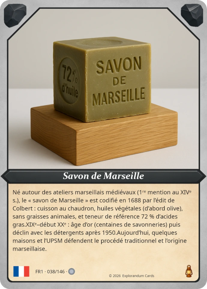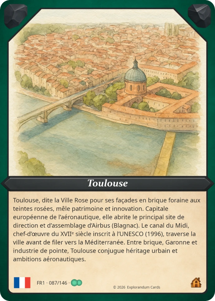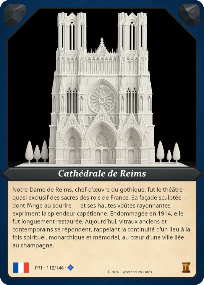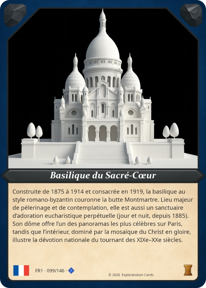 Bienvenue dans la première série de cartes à collectionner Explorandum, dédiée aux richesses culturelles de la France. Ce set inaugural célèbre la diversité du patrimoine français, des montagnes alpines aux côtes méditerranéennes. Collectionnez les saveurs emblématiques, explorez les régions et plongez dans l'histoire de plats qui ont façonné l'identité nationale. Que votre voyage de collection commence ici !