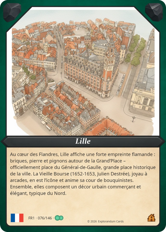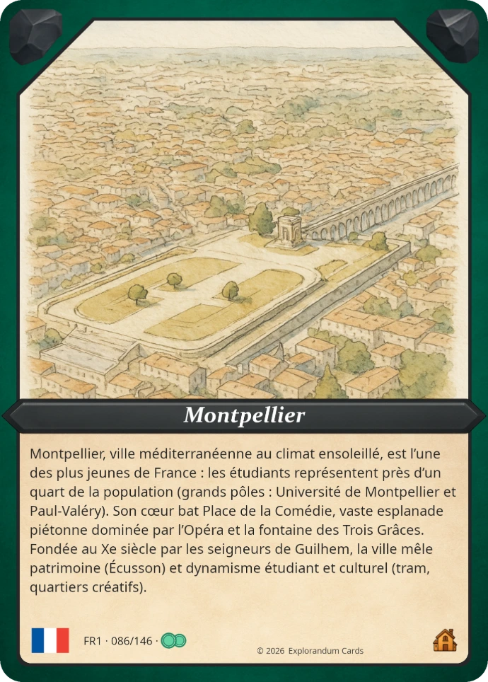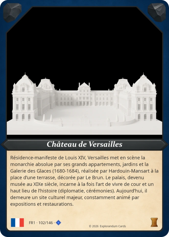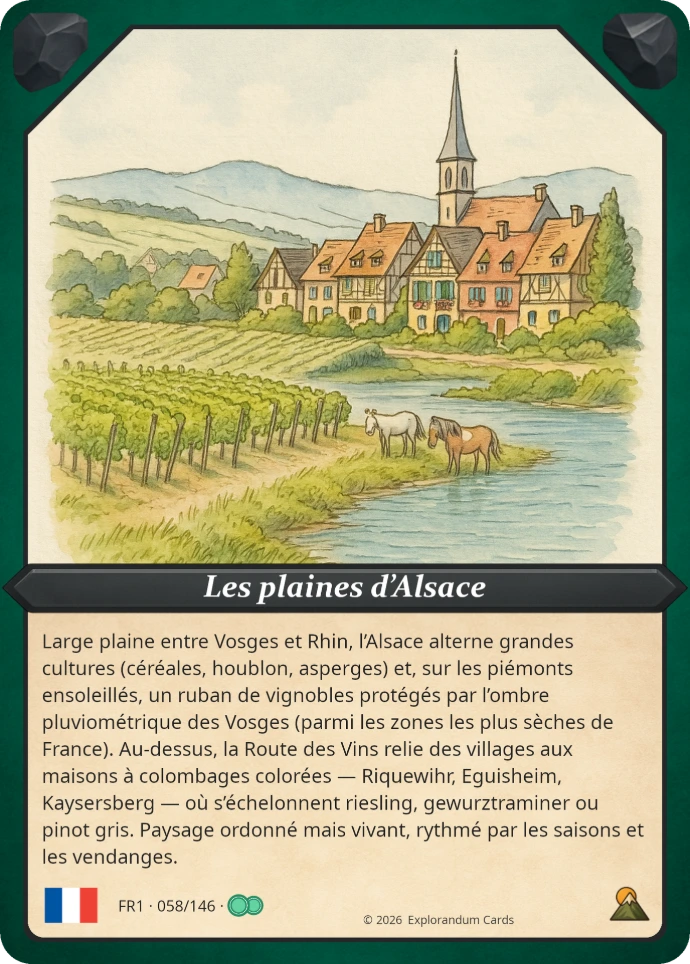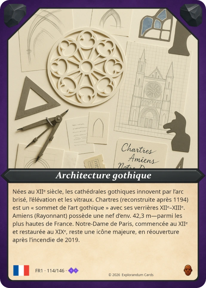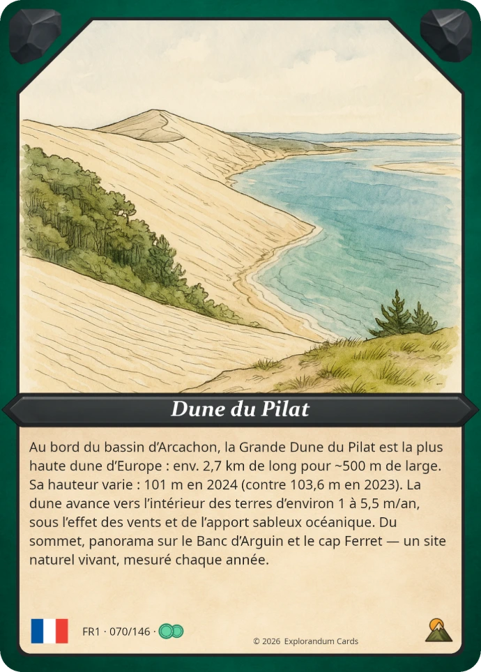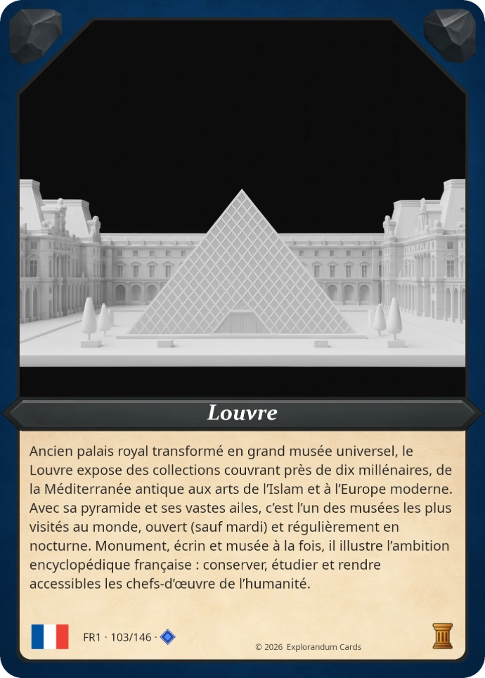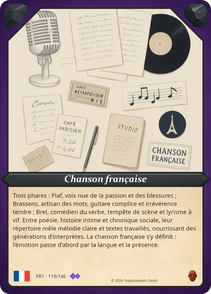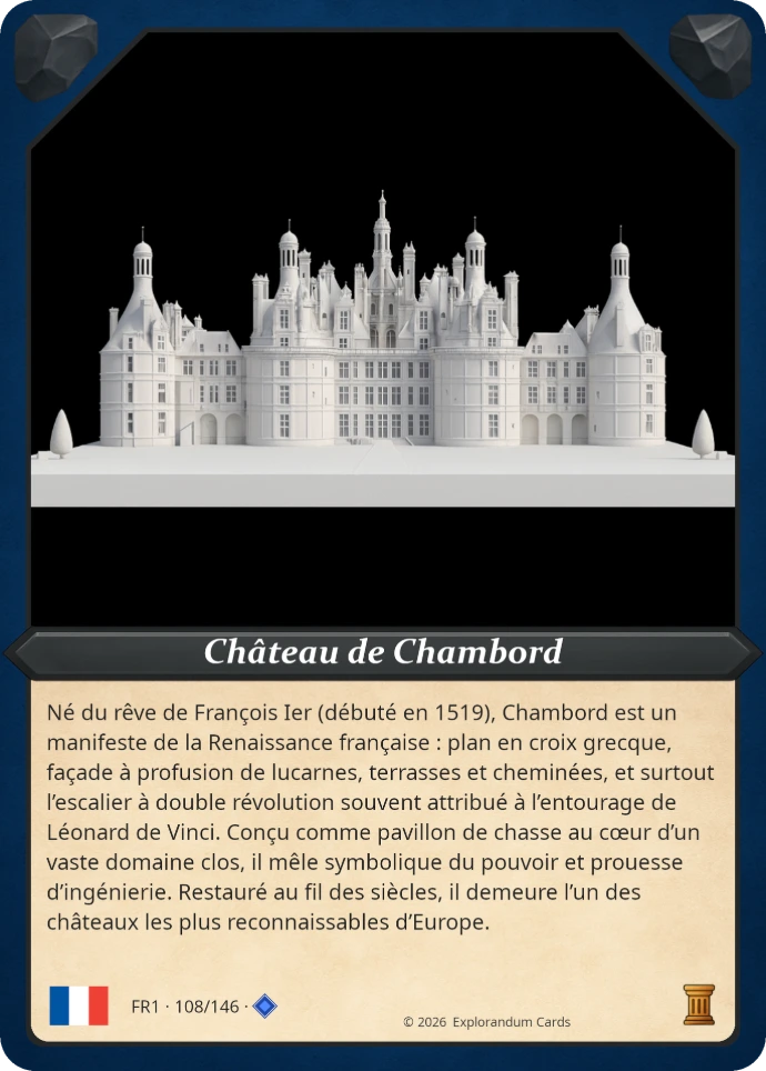 Bienvenue dans la première série de cartes à collectionner Explorandum, dédiée aux richesses culturelles de la France. Ce set inaugural célèbre la diversité du patrimoine français, des montagnes alpines aux côtes méditerranéennes. Collectionnez les saveurs emblématiques, explorez les régions et plongez dans l'histoire de plats qui ont façonné l'identité nationale. Que votre voyage de collection commence ici !