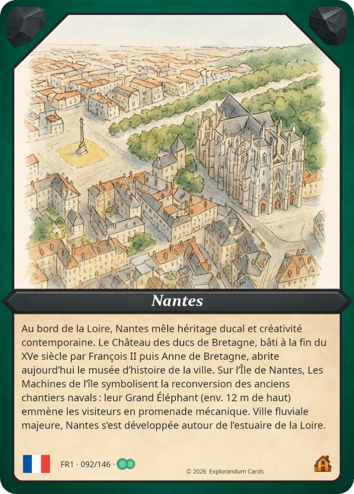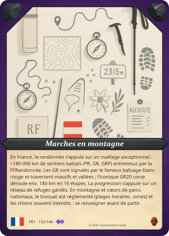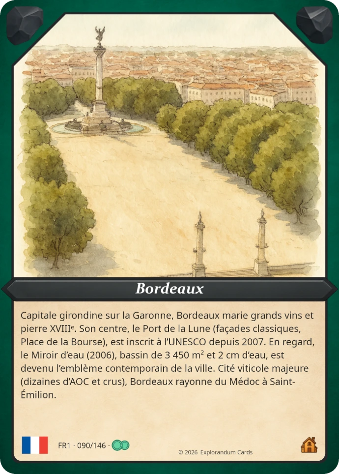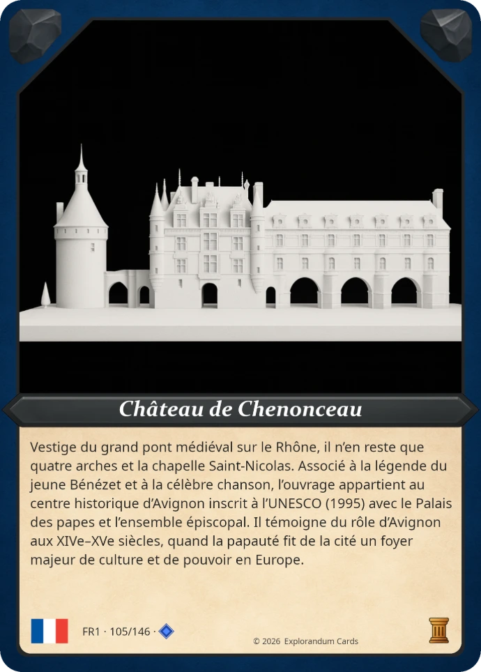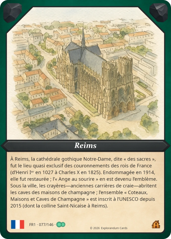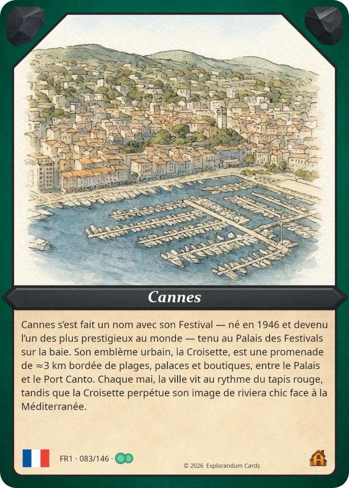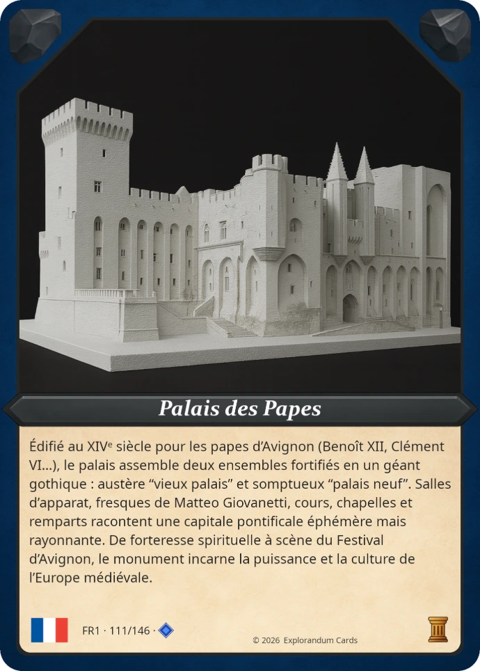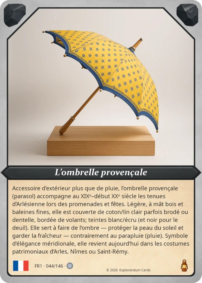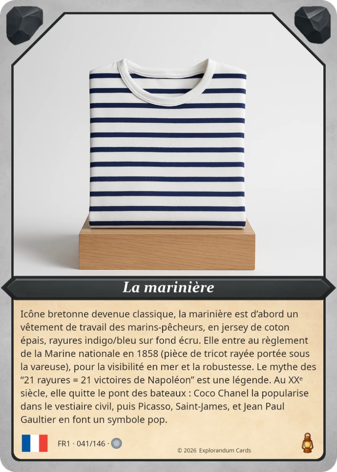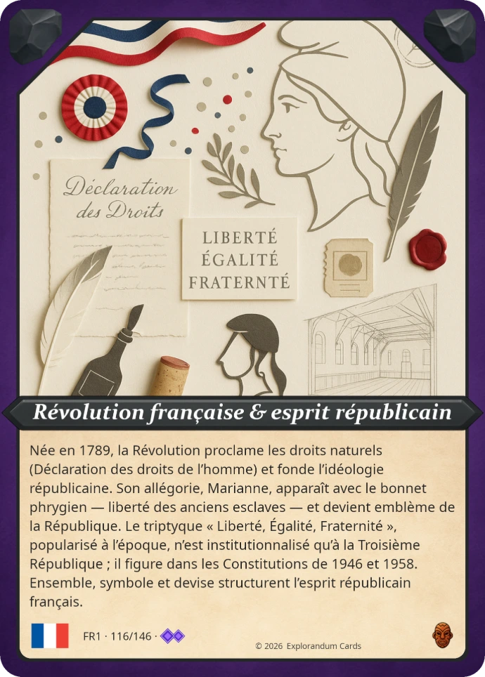 Bienvenue dans la première série de cartes à collectionner Explorandum, dédiée aux richesses culturelles de la France. Ce set inaugural célèbre la diversité du patrimoine français, des montagnes alpines aux côtes méditerranéennes. Collectionnez les saveurs emblématiques, explorez les régions et plongez dans l'histoire de plats qui ont façonné l'identité nationale. Que votre voyage de collection commence ici !